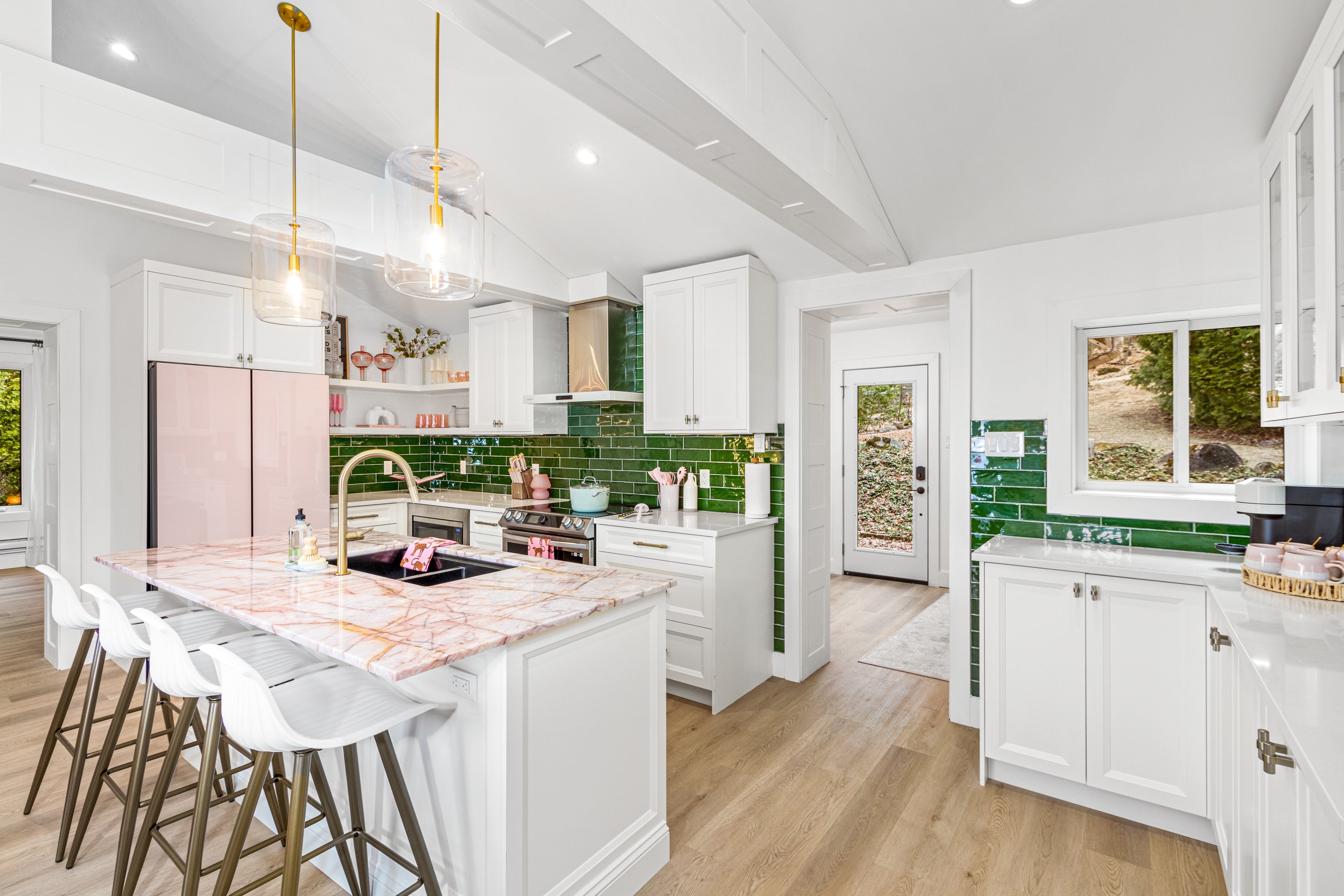 Nestled in the trees is this (yes, pink) 4 bedroom, 2 bath cottage with vaulted ceilings and an incredible view right on the lakefront. Suited for both families and friends, this cottage is meant to take you away into a peaceful, yet fun - home away from home.